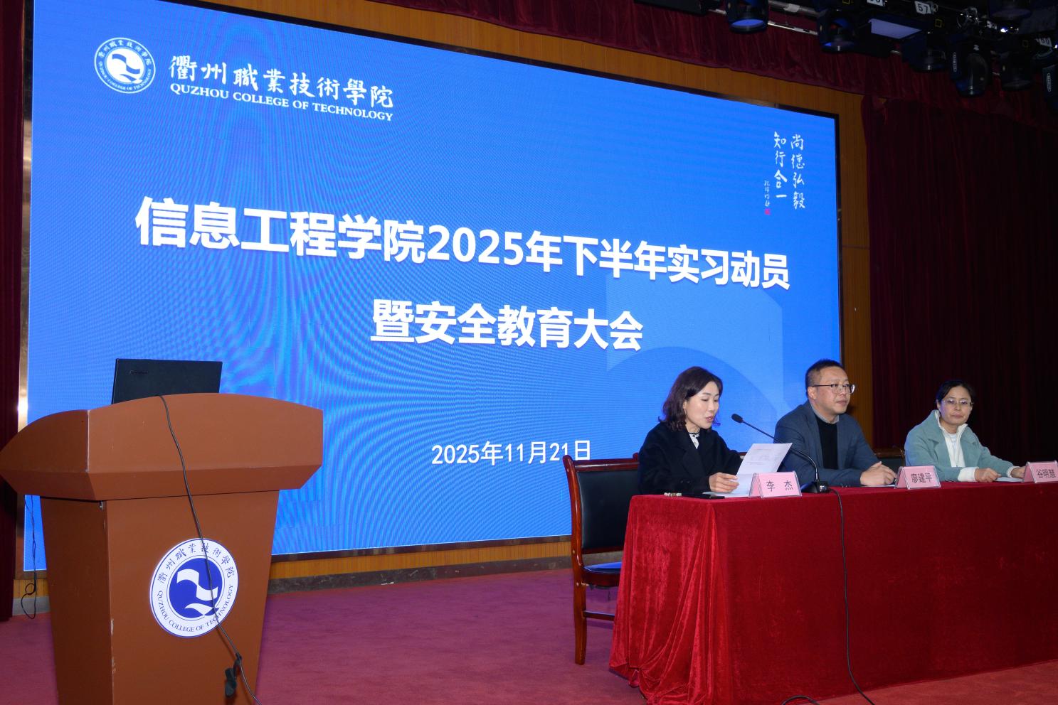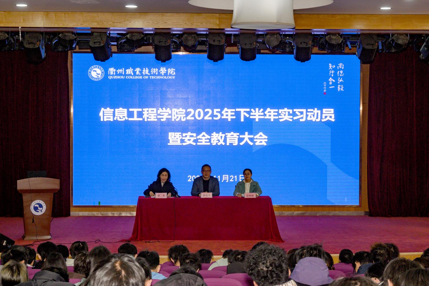 为切实做好2026届毕业生实习工作,明确实习要求、强化安全意识,帮助学生平稳有序开启职场第一步,11月21日下午,信息工程学院在图书馆1号报告厅分两场召开2025年下半年实习动员暨安全教育大会。学院党总支书记廖建平、副书记谷明慧、副院长李杰,各毕业班班主任、联络辅导员及2026届毕业生共同参会。