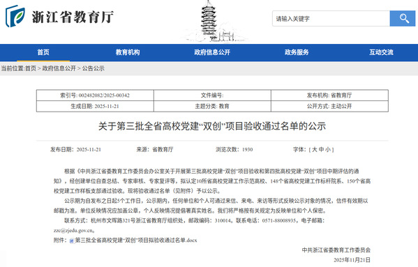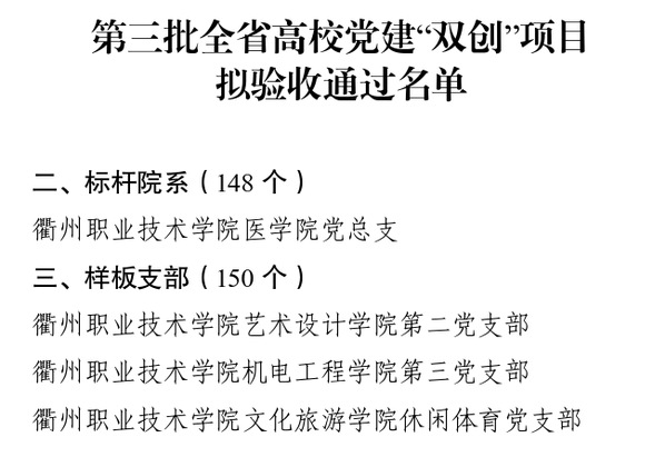 近日,中共浙江省委教育工作委员会公布了第三批全省高校党建“双创”项目验收通过名单,雷火真人网站医学院党总支、艺术设计学院第二党支部、机电工程学院第三党支部和文化旅游学院休闲体育党支部等四个党组织全部顺利通过验收。